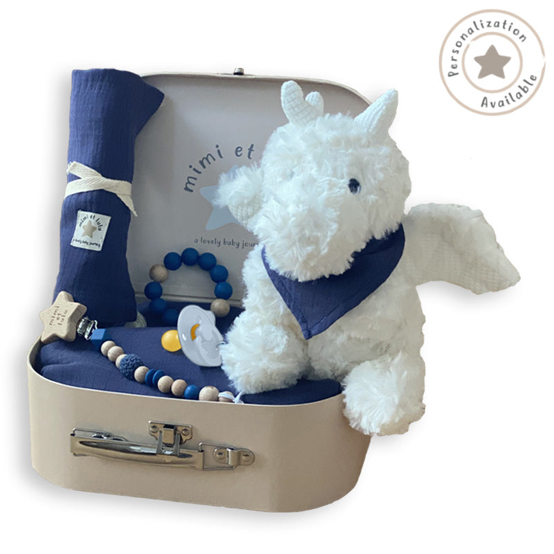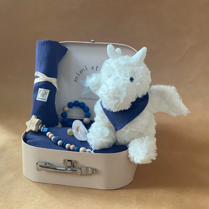 Introducing our OH CHEERY DAYS Holiday Gift Box, a captivating collection in mesmerizing red tones. It highlights the exquisite contents of this set, including our 60 cm x 60 cm organic cotton swaddle WRAP ME, a versatile pacifier holder called CARRY ME, a soothing teether SOOTHE ME, an adorable dragon plush OH GRACIOUS and a timeless BIBS pacifier. All thoughtfully enclosed in a signature mimi et lulu suitcase and accompanied by an organic tote bag. Personalize these beautiful items with a name in English or Chinese, creating an unforgettable and heartfelt gift. Celebrate with style and create cherished memories with this remarkable baby hamper.